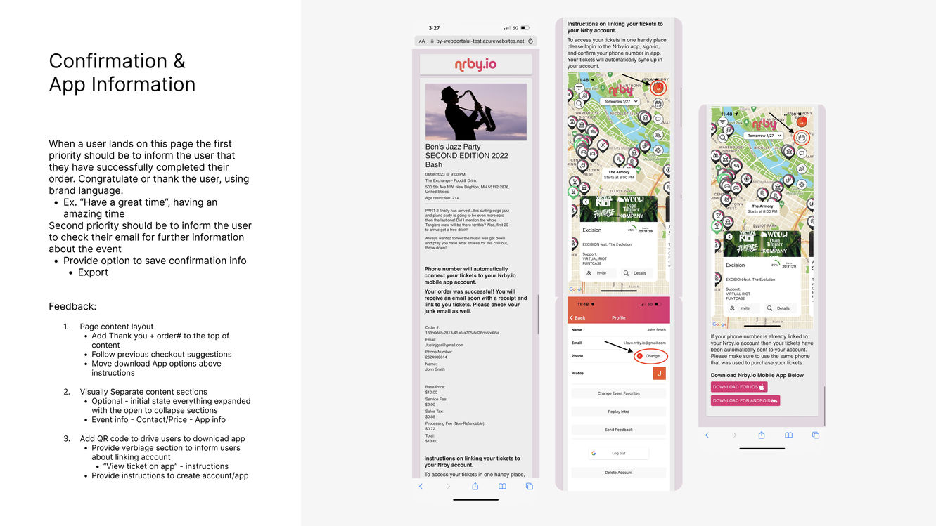 I conducted a thorough review of NRBY's dark-themed interface and minimalist navigation. Key insights included a fragmented ticket purchase experience, underutilized profile pages, and accessibility challenges. On mobile, the 4-step checkout flow proved cumbersome, with inconsistent responsiveness and slow load times for image-heavy event pages.